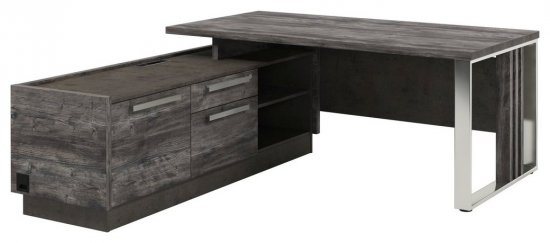 Стол левый с опорной тумбой и металлической опорой с блоком розеток- Сосна Пасадена/Бетон Чикаго